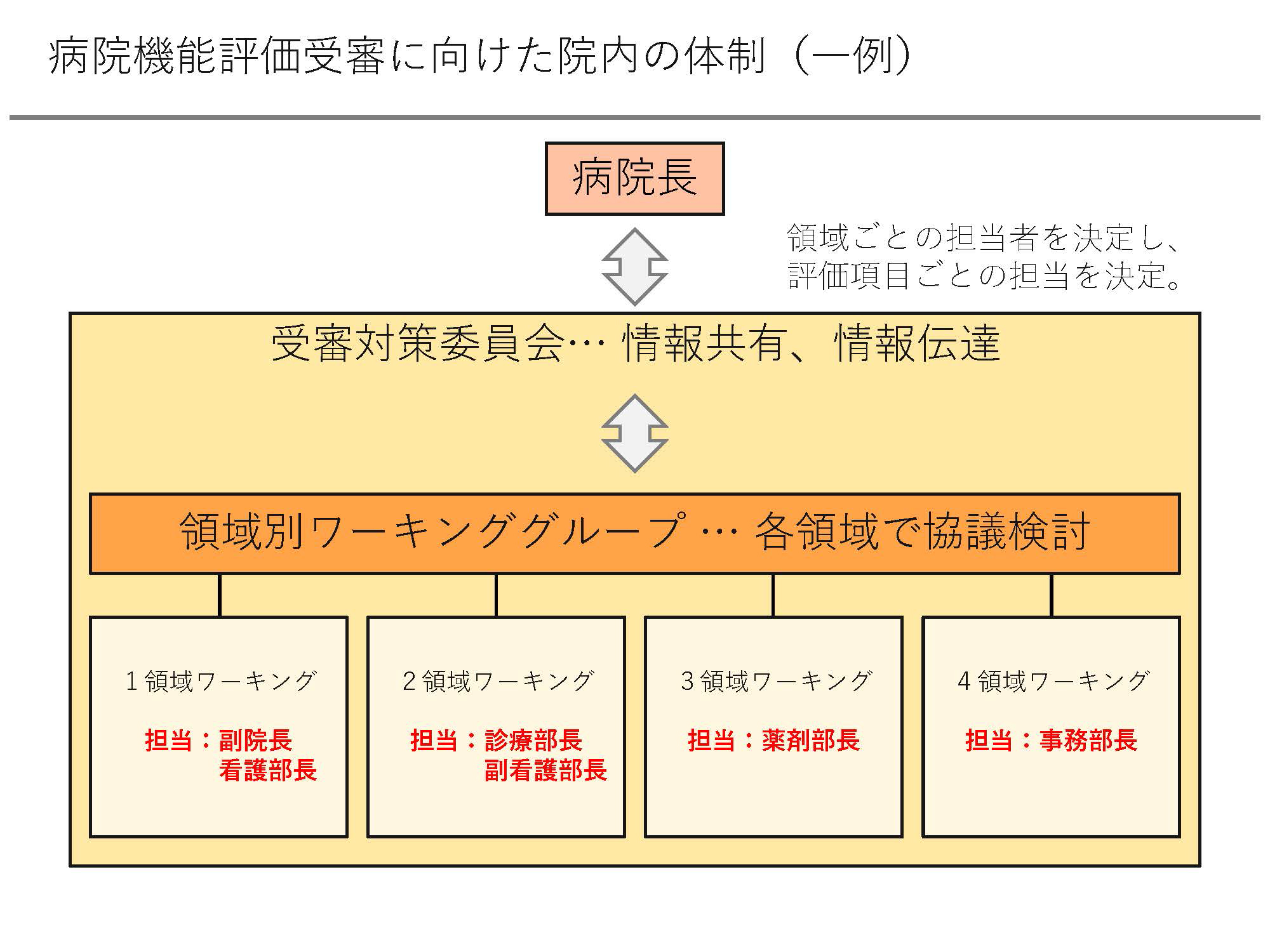 図は、受審に向けた体制図の一例です。指揮命令は院長発信とし、4領域それぞれのメインとなる担当者を決定します。
