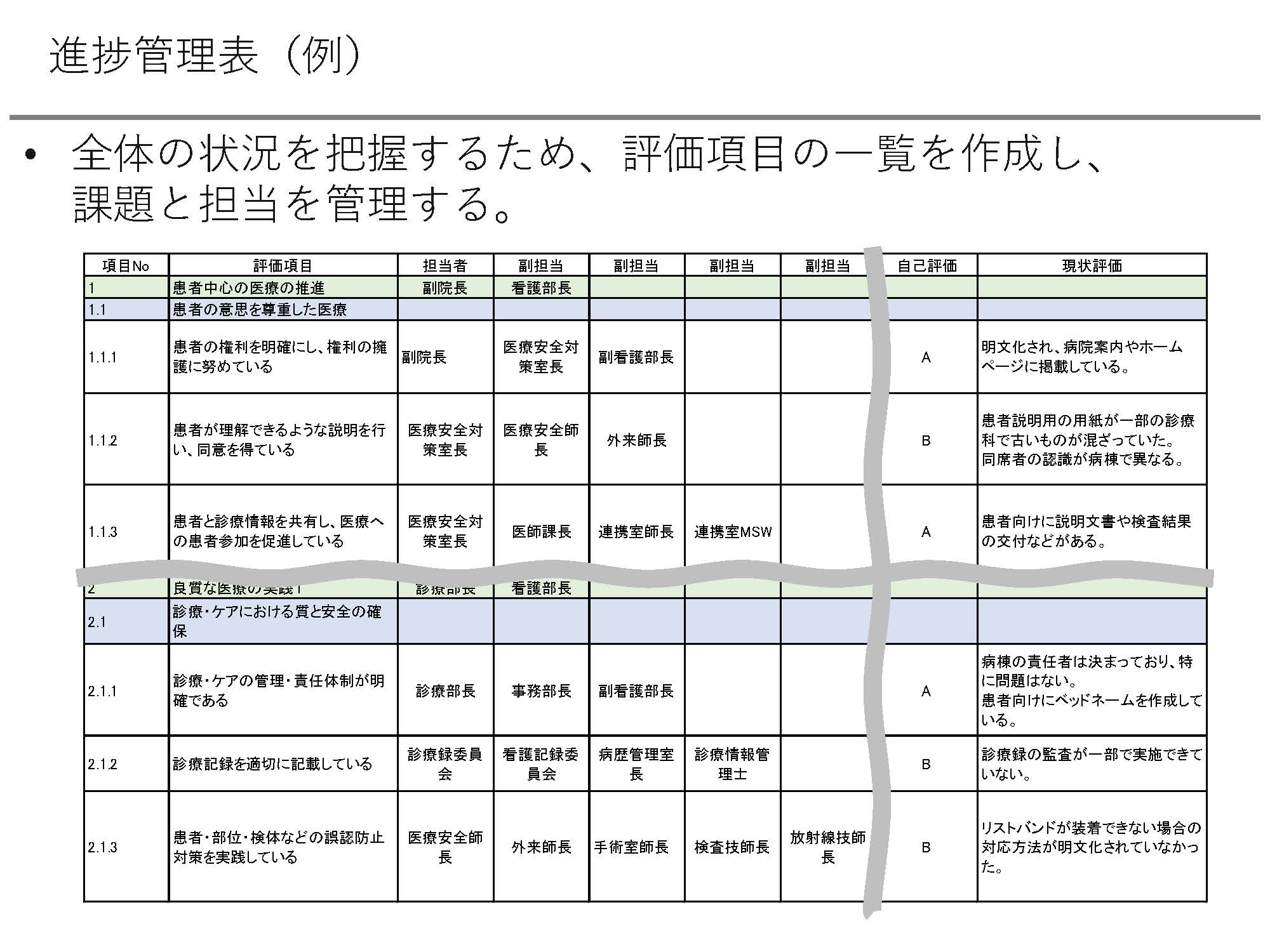 その後、全体の評価項目の一覧を作成し、課題と担当を管理します。